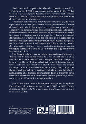 English summary: Arnau de Vilanova was one of the most singular thinkers of this time, producing erudite theological treatises that would bring the criticism and condemnation of the institutional Church on his work after his death. The volume offers first a panorama of Vilanova's exceptional life and thought, followed by French translations of his Catalan treatises - these texts present a clear and concise view of the themes Vilanova developed in his larger body of Latin works. French description: Medecin et maitre spirituel celebre en son temps (France, Italie et Espagne, deuxieme moitie du XIIIe siecle), Arnau de Villeneuve, protege par les papes Boniface VIII et Clement V qu'il avait gueris de maladies douloureuses, a subi apres sa mort une eradication aussi systematique que possible de toutes traces de ses ecrits par ses adversaires. Theologien de talent verse dans l'alchimie et l'astrologie, il devient rapidement un maitre spirituel tres ecoute, prophetisant le retour de l'Antechrist et la fin des temps. Ne reconnaissant qu'une autorite singuliere, la sienne, ainsi que celle de toute personnalite individuelle, il conteste celle des institutions, denonce les maux du siecle et designe les coupables. Rapidement inquiete par les tribunaux, suspecte d'heterodoxie et d'heresie, il ne doit son salut qu'a sa reputation de medecin. Prevoyant de son vivant que tout ce qui pourrait etre jete au feu de ses ecrits le serait, il a developpe une puissance peu commune de publication litteraire, son organisation editoriale de grande envergure permettant a certains de ses traites une large diffusion... et leur survie partielle. Jean Canteins dresse tout d'abord le panorama de la vie exceptionnelle et de l'oeuvre d'Arnau de Villeneuve tenant compte des derniers acquis de la recherche. Il a privilegie dans la deuxieme partie la traduction des traites catalans qui ont subsiste, a l'authenticite reconnue et ayant l'avantage d'offrir sous une forme concise un apercu assez complet des themes developpes dans les multiples textes latins dont l'attribution reste, elle, encore douteuse pour certains. Enfin la troisieme partie ebauche le repertoire des hommes et des femmes qui ont recu, connu ou pris en consideration le message arnaldien.