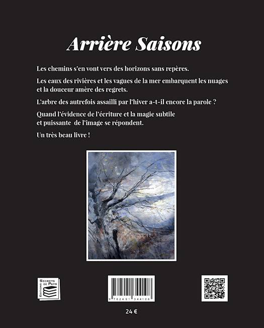 « Les chemins s’en vont vers des horizons sans repères. Les eaux des rivières et les vagues de la mer embarquent les nuages et la douceur amère des regrets. L’arbre des autrefois assailli par l’hiver a-t-il encore la parole ? Quand l’évidence de l’écriture et la magie subtile et puissante de l’image se répondent… Un très beau livre ! » Pierre GONTHIER est membre de l’Académie des Lettres et des Arts du Périgord et de l’Institut Eugène Le Roy. Ses ouvrages, romans, nouvelles, recueils de poèmes, empreints d’une nostalgie souriante, ont fait l’objet de nombreuses distinctions. Il a reçu, pour l’ensemble de son œuvre, le Grand Prix international 2014, décerné par la Société des Poètes et Artistes de Langue Française, sous l’égide de la Présidence de la République. Marcel PAJOT est également membre de l'Académie des Lettres et des Arts du Périgord. Ses œuvres ont été accrochées aux cimaises de diverses expositions en France et à l'étranger : « Art Expo » à New York, « Europ’Art » à Genève et Bruxelles, et ont reçu de nombreux Grands Prix. Depuis 2000, ses toiles sont présentées exclusivement par la Galerie Mickaël Marciano, 26, place des Vosges à Paris, sous son nom d'artiste, Marcel Nino Pajot. Arrière Saisons est un recueil de 15 textes en prose et 19 poésies de Pierre Gonthier, et de 43 tableaux de Marcel Pajot. Cet opus met en scène deux artistes qui jouent là une partition à quatre mains. L’un s’exprime avec des mots, l’autre avec son pinceau et sa palette de couleurs. De cette rencontre naît une œuvre sensible, sensuelle et poétique, nostalgique, tour à tour souriante puis mélancolique, mais tellement juste, vraie, authentique. L’amour et l’amitié y sont toujours en filigrane, ainsi que le temps qui passe, quand arrivent les arrière-saisons…