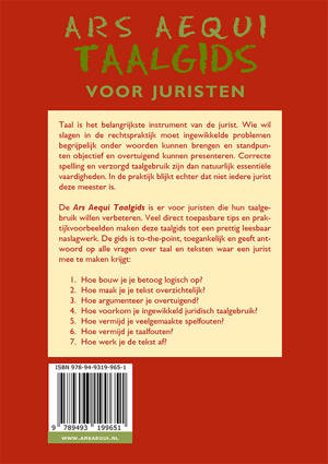 De Ars Aequi Taalgids is er voor juristen die hun taalgebruik willen verbeteren. Veel direct toepasbare tips en praktijkvoorbeelden maken deze taalgids tot een prettig leesbaar naslagwerk. De gids is to-the-point, toegankelijk en geeft antwoord op alle vragen over taal en teksten waar een jurist mee te maken krijgt: