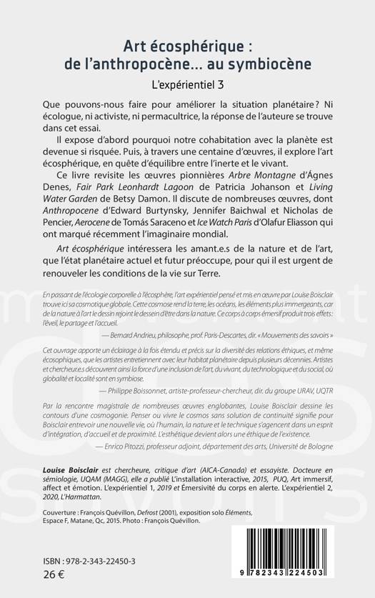 Que pouvons-nous faire pour améliorer la situation planétaire ? Ni écologue, ni activiste, ni permacultrice, la réponse de l'auteure se trouve dans cet essai. Il expose d'abord pourquoi notre cohabitation avec la planète est devenue si risquée. Puis, à travers une centaine d'oeuvres, il explore l'art écosphérique, en quête d'équilibre entre l'inerte et le vivant. Cet ouvrage revisite les oeuvres pionnières d'Ágnes Denes, Patricia Johanson et Betsy Damon. Il discute de nombreuses oeuvres, dont celles d'Edward Burtynsky, Jennifer Baichwal, Nicholas de Pencier, ou de Tomás Saraceno et Olafur Eliasson qui ont marqué récemment l'imaginaire mondial.