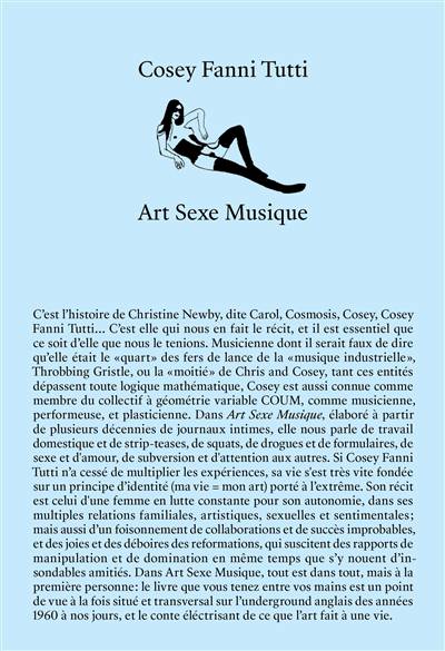 C'est l'histoire de Christine Newby, dite Carol, Cosmosis, Cosey, Cosey Fanni Tutti... C'est elle qui nous en fait le récit, et il est essentiel que ce soit d'elle que nous le tenions. Musicienne dont il serait faux de dire qu'elle était le « quart » des fers de lance de la « musique industrielle », Throbbing Gristle, ou la « moitié » de Chris and Cosey, tant ces entités dépassent toute logique mathématique, Cosey est aussi connue comme membre du collectif à géométrie variable COUM, comme musicienne, performeuse, et plasticienne. Dans Art Sexe Musique, élaboré à partir de plusieurs décennies de journaux intimes, elle nous parle de travail domestique et de strip-teases, de squats, de drogues et de formulaires, de sexe et d'amour, de subversion et d'attention aux autres. Dans Art Sexe Musique, tout est dans tout, mais à la première personne : un point de vue sur l'underground anglais des années 1960 à nos jours, et le conte électrisant de ce que l'art fait à une vie.