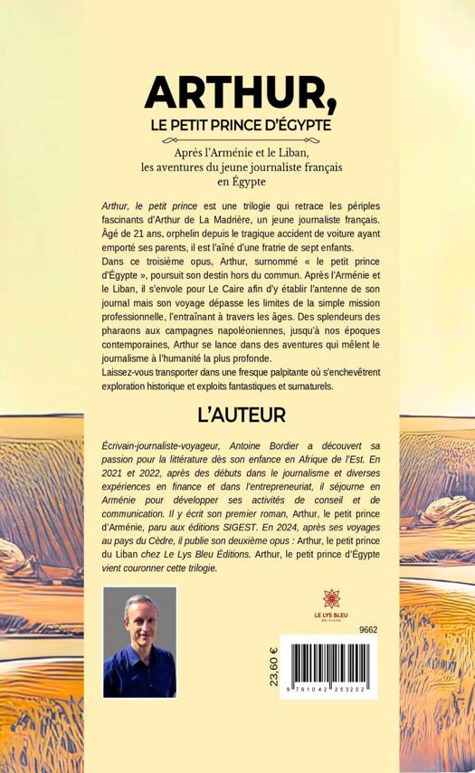 Arthur, le petit prince est une trilogie qui retrace les périples fascinants d'Arthur de La Madrière, un jeune journaliste français. Âgé de 21 ans, orphelin depuis le tragique accident de voiture ayant emporté ses parents, il est l'aîné d'une fratrie de sept enfants. Dans ce troisième opus, Arthur, surnommé « le petit prince d'Égypte », poursuit son destin hors du commun. Après l'Arménie et le Liban, il s'envole pour Le Caire afin d'y établir l'antenne de son journal mais son voyage dépasse les limites de la simple mission professionnelle, l'entraînant à travers les âges. Des splendeurs des pharaons aux campagnes napoléoniennes, jusqu'à nos époques contemporaines, Arthur se lance dans des aventures qui mêlent le journalisme à l'humanité la plus profonde.