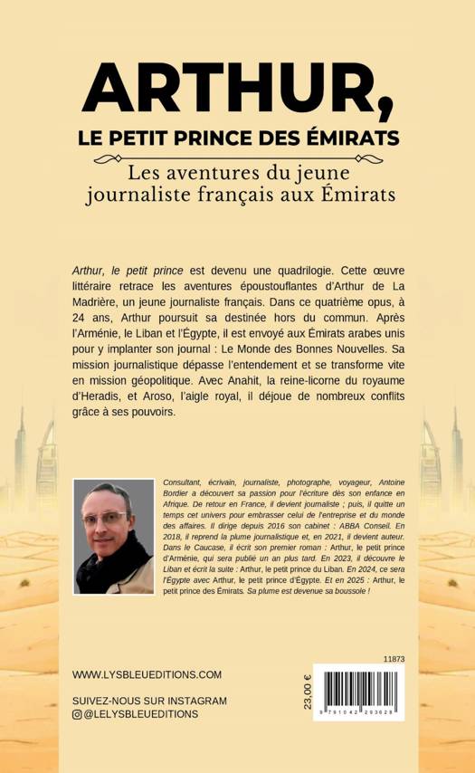Arthur, le petit prince est devenu une quadrilogie. Cette oeuvre littéraire retrace les aventures époustouflantes d'Arthur de La Madrière, un jeune journaliste français. Dans ce quatrième opus, à 24 ans, Arthur poursuit sa destinée hors du commun. Après l'Arménie, le Liban et l'Égypte, il est envoyé aux Émirats arabes unis pour y implanter son journal : Le Monde des Bonnes Nouvelles. Sa mission journalistique dépasse l'entendement et se transforme vite en mission géopolitique. Avec Anahit, la reine-licorne du royaume d'Heradis, et Aroso, l'aigle royal, il déjoue de nombreux conflits grâce à ses pouvoirs.