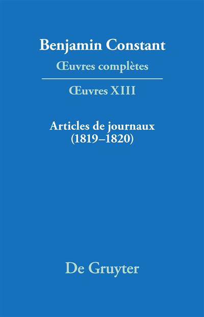 Ce volume XIII contient l'ensemble des articles publiés par Benjamin Constant durant les années 1819-1820, soit près de 120 contributions. Parus dans les principaux journaux libéraux de cette période (La Minerve française, La Renommée, Le Courrier français...), ces textes révèlent une facette essentielle et méconnue de l'engagement politique et intellectuel de Constant sous la Restauration. Il s'agit de la première édition véritablement scientifique et exhaustive de cet important corpus d'articles, dont la qualité et la diversité démontrent que Constant ne fut pas seulement un grand romancier et théoricien politique, mais aussi un journaliste de premier plan.