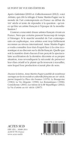 Après «Galeristes» (2010) et «Collectionneurs» (2012), voici «Artistes», qui clôt la trilogie d'Anne Martin-Fugier sur le monde de l'art contemporain en France au début du XXIe siècle et tente de répondre à la question : qu'est-ce qu'être un artiste français à l'époque de la mondialisation ?