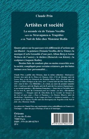 Quatre pièces sur les parcours très différenciés d'artistes qui ont illustré la peinture (Tizianio Vecellio, dit Le Titien) ; la musique (Carlo Gesualdo d'une part, Alban Berg et Anton Webern de l'autre) ; le théâtre (Heinrich von Kleist) ; la sculpture (Auguste Rodin). Destins faits de combats plus ou moins exacerbés avec la société, compliqués pour certains créateurs, par des luttes intimes avec leur personnalité...