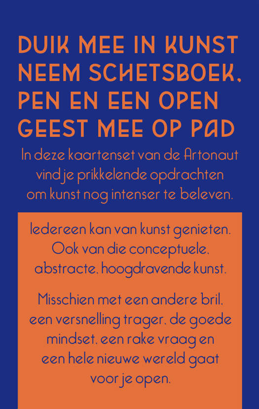 Met de Artonaut reis je alleen, samen of met een groep doorheen musea en tentoonstellingen. Neem schetsboek, pen en een open geest mee op pad. Sommige opdrachten laten je discussiëren, schrijven of zelf creëren, met een expo als grondstof. Andere artonautkaarten laten je de werken met andere ogen benaderen of zetten al je zintuigen in om kunst te proeven. Zo wordt je museumbezoek een rijke expeditie.