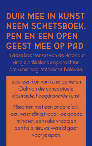 is een kaartenset van en voor Ruimtereizigers vol prikkelende opdrachten om musea nog intenser te beleven. Dwaal af van voorgeschreven paden, zwerf door betekenissen en struikel over details.Want kunst is voor iedereen! Iedereen kan van kunst genieten. Ook van die intellectuele, conceptuele, abstracte, hoogdravende kunst. Een andere bril, een versnelling trager, de goede mindset, af en toe de juiste vraag en een hele nieuwe wereld gaat voor je open.