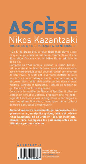 « Ce fut la graine d'où a fleuri toute mon oeuvre ; tout ce que j'ai pu écrire ne fut qu'un commentaire et une illustration d'Ascèse », écrivit Nikos Kazantzaki à la fin de sa vie. Composé en 1923, lorsque, résidant à Berlin, Kazantzaki nourrissait le désir de faire oeuvre d'écrivain sans avoir encore produit ce qui pourrait constituer le noyau de son travail, ce texte est la véritable matrice de tous ses écrits à venir. Marqué par le communisme, qu'il découvre alors, et la philosophie de ses deux grands maîtres, Bergson et Nietzsche, il décide de rédiger ce qui fondera le socle de sa pensée. Conçu sur le modèle du Manuel d'Épictète, il offre au lecteur un véritable viatique, proposant une méthodologie de l'ascèse qui vise à progresser « par degrés » vers une ultime libération, quand bien même celle-ci demeure sans cesse à reconquérir.