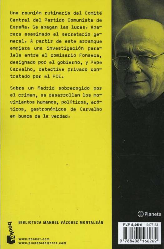 Una reunión rutinaria del Comité Central del Partido Comunista de España. Se apagan las luces. Aparece asesinado el secretario general, Fernando Garrido. A partir de este arranque empieza una investigación paralela entre el comisario Fonseca, designado por el gobierno, y Pepe Carvalho, detective privado contratado por el PCE. Sobre un Madrid sobrecogido por el crimen, se desarrollan los movimientos humanos, políticos, eróticos, gastronómicos de Carvalho en busca de la verdad. La antigua historia militante de Carvalho aparece como un punto de referencia constante, y aunque la novela es básicamente una novela de aventuras con todos los ingredientes «carvalhianos», ofrece como fondo un riguroso paisaje político y en el horizonte el enigma del futuro de España.