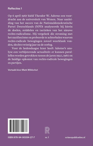 Op 6 april 1967 hield Theodor W. Adorno een voordracht aan de universiteit van Wenen. Naar aanleiding van het succes van de Nationaldemokratische Partei Deutschlands (NPD) analyseerde hij hierin de doelen, middelen en tactieken van het nieuwe rechts-radicalisme. Hij vergeleek die stroming met het nazifascisme en probeerde te achterhalen waarom rechts-radicale bewegingen zoveel weerklank vonden, slechts twintig jaar na de oorlog. Voor de hedendaagse lezer heeft Adorno’s analyse een verbijsterende actualiteit: er kunnen parallellen worden getrokken tussen de jaren 1940, 1960 en de huidige opkomst van rechts-radicale bewegingen en partijen.