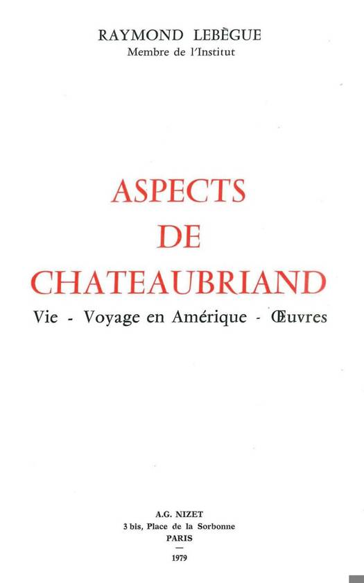Cet ouvrage rassemble les nombreuses etudes de Raymond Lebegue consacrees a Chateaubriand. Les thematiques abordees sont moins issues d'un esprit de specialisation etroit que d'un coeur s'offrant aux hasards des lectures et des rencontres. Une telle approche par accumulation de fragments presente certains avantages, notamment sur la classique "biographie chronologique et raisonnee". Le fragment, comme en photographie une prise de vue rapprochee, s'attache d'emblee a la precision, par la focalisation sur le "detail agrandi". L'objectivite y gagne necessairement. Mais, plus important, la recherche aussi. C'est ainsi que l'ouvrage de Raymond Lebegue apporte de nouveaux eclairages sur certains points de la vie ou de l'oeuvre de Chateaubriand, et parfois des decouvertes. Le voyage en Amerique de 1791 fait l'objet d'une longue analyse (distribuee en fragments, selon la methode suivie) restant aujourd'hui une reference incontournable a ce sujet. Autour de ce noyau gravite une constellation d'etudes particulieres parfois inedites ou considerablement approfondies: on lira ainsi avec grand interet les pages consacrees a Hortense Allart ("la derniere maitresse") ou celles sur l'influence de Montaigne sur Chateaubriand.