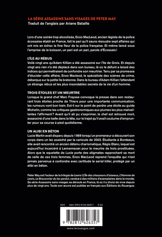 Lors d'une soirée trop alcoolisée, Enzo MacLeod, ancien légiste de la police écossaise établi en France, fait le pari qu'il saura résoudre sept affaires qui ont mis en échec la fine fleur de la police française. Et même lancé sous l'emprise de la boisson, un pari est un pari, parole d'Écossais ! Ce volume omnibus rassemble trois titres de la série Assassins sans visages, la série française de Peter May, qui compte en tout sept volumes : L'Île au rébus, Trois étoiles et un meurtre et Un alibi en béton.