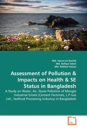 Industrial estate is an increasing source of pollution. The aim of study was assessment of pollution of Mongla Industrial Estate & its impacts on health and socio-economic Status in BD. These experiments give a result that in water polluting industry BOD (1190 mg/l), COD (4330 mg/l) and TDS ( 8840 mg/l) are very high and pH (2.23) shows very acidic in nature of the effluent of MSFPI. Air pollution is severe in this area, at the ball mill (MCF) SPM was 520 µg/m3, & ambient air of area contains 510 µg/m3 of SPM. Noise level at ball mill average 100 dB. These values do not meet the DoE std. & affects the workers & people in vicinity of estate. 39%, 23%, 17%, 13% are suffered by skin diseases, diarrhea, typhoid, dysentery respectively. 32%, 30%, 7%, 25%, 5% of people are suffered by breathlessness, wheezing, bronchitis, asthma and allergy respectively. 31%, 23%, 21%, 14% of people are suffered by sleeping problem, headache, heart pain, blood pressure respectively. The treatment cost of the people is 7% of their yearly income. About 59%, 11%, 30% of people are industrial labor, farmers and other type of workers respectively.