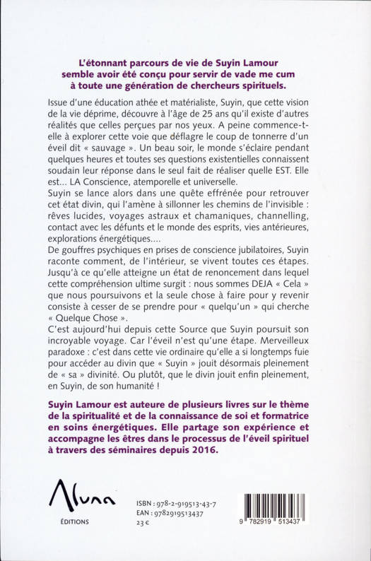 L’étonnant parcours de vie de Suyin Lamour semble avoir été conçu pour servir de vade me cum à toute une génération de chercheurs spirituels. Issue d'une éducation athée et matérialiste, Suyin, que cette vision de la vie déprime, découvre à l'âge de 25 ans qu’il existe d’autres réalités que celles perçues par nos yeux. À peine commence-t-elle à explorer cette voie que déflagre le coup de tonnerre d’un éveil dit « sauvage ». Un beau soir, le monde s’éclaire pendant quelques heures et toutes ses questions existentielles connaissent soudain leur réponse dans le seul fait de réaliser quelle EST. Elle est... LA Conscience, atemporelle et universelle. Suyin se lance alors à cœur perdu dans une quête effrénée pour retrouver cet état divin, qui l’amène à sillonner tous les chemins de l’invisible : rêves lucides, voyages astraux et chamaniques, channeling, contact avec les défunts et le monde des esprits, vies antérieures, explorations énergétiques, méditation.... Une année chassant l’autre, de gouffres psychiques en prises de conscience jubilatoires, Suyin raconte comment, de l'intérieur, se vivent toutes ces étapes. Jusqu’à ce qu'elle atteigne un état d'épuisement et de renoncement dans lequel cette compréhension ultime surgit : nous sommes DEJA « Cela » que nous poursuivons et la seule chose à faire pour y revenir consiste à abandonner la croyance d’être « quelqu’un » qui cherche « Quelque Chose » pour accueillir « Ce qui est ». C’est aujourd’hui depuis cette Source que Suyin poursuit son incroyable voyage. Car l’éveil n’est qu’une étape. Etape qui permet à la Conscience de jouir pleinement de toutes les caractéristiques du personnage et de la Vie. Merveilleux paradoxe : c’est dans cette vie ordinaire qu’elle a si longtemps fuie pour accéder au divin que « Suyin » jouit désormais pleinement de « sa » divinité. Ou plutôt, que le divin jouit enfin pleinement, en Suyin, de son humanité !