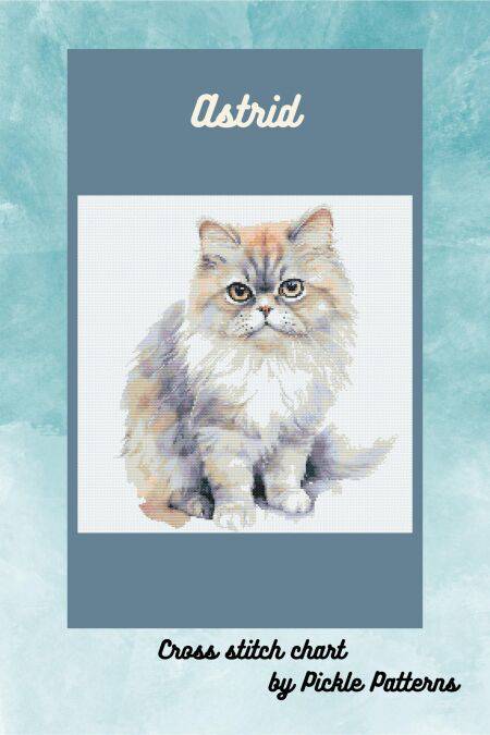 The background is a simple, even light blue. The background is not distracting and allows the cat to stand out prominently. The overall atmosphere and mood are serene and peaceful, reflecting the calm expression of the cat and the soft color palette. The style is realistic and detailed despite the cross-stitch medium. The uniformity of the background coupled with the soft color tone creates a tranquil mood. The image has a gentle, charming quality, suitable for a craft project that evokes feelings of peace and quiet.
