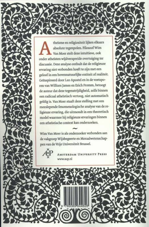 Atheïsme en religiositeit lijken elkaars absolute tegenpolen. Filosoof Wim Van Moer stelt deze intuïtieve, ook onder atheïsten wijdverspreide overtuiging ter discussie. Deze analyse onthult dat de religieuze ervaring niet verbonden hoeft te zijn met een geloof in een bovennatuurlijke entiteit of realiteit. Geïnspireerd door Leo Apostel en in de vo