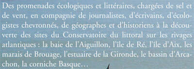 Des promenades écologiques et littéraires, chargées de sel et de vent, en compagnie de journalistes, d'écrivains, d'écologistes chevronnés, de géographes et d'historiens à la découverte des sites du Conservatoire du littoral sur les rivages atlantiques : la baie de l'Aiguillon, l'île de Ré, l'île d'Aix, les marais de Brouage, l'estuaire de la Gironde, le bassin d'Arcachon, la corniche Basque...