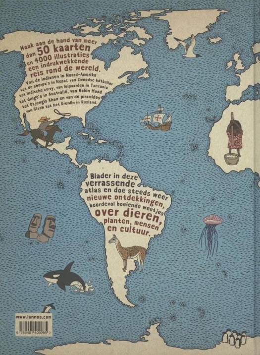 Groot, kleurrijk, verrassend: een adembenemende atlas Boordevol boeiende weetjes over fauna, flora, cultuur, bevolking, enz. Wat zijn de populairste voornamen in China? Welke vissen vind je in de Indische Oceaan? Wat zijn de nationale sporten van Canada? Waar eten ze kötbullar? In welk land ligt de historische stad Petra? Waar doen ze aan zandboarding?