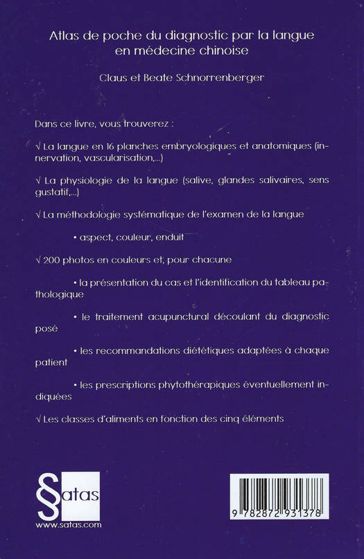 Dans ce livre, vous trouverez : La langue en 16 planches embryologiques et anatomiques (innervation, vascularisation) ; La physiologie de la langue (salive, glandes salivaires, sens gustatif) ; La méthodologie systématique de l'examen de la langue : aspect, couleur, enduit ; 200 photos en couleurs et, pour chacune : la présentation du cas et l'identification du tableau pathologique, le traitement acupunctural découlant du diagnostic posé, les recommandations diététiques adaptées à chaque patient, les prescriptions phytothérapiques éventuellement indiquées ; les classes d'aliments en fonction des cinq éléments.