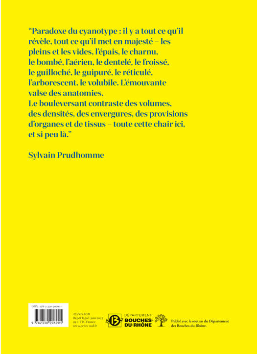 "Paradoxe du cyanotype : il y a tout ce qu'il révèle, tout ce qu'il met en majesté - les pleins et les vides, l'épais, le charnu, le bombé, l'aérien, le dentelé, le froissé, le guilloché, le guipuré, le réticulé, l'arborescent, le volubile. L'émouvante valse des anatomies. Le bouleversant contraste des volumes, des densités, des envergures, des provisions d'organes et de tissus - toute cette chair ici, et si peu là."
