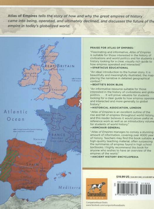 Atlas of Empires tells the story of how and why the great empires of history came into being, operated, and ultimately declined, and it discusses the future of the empire in today's globalized world. This book features 60 beautiful and detailed maps of the empires' territories at different stages of their existence, and it organizes them thematically to reflect the different driving forces behind empires throughout history (such as faith, nomadic culture, nationhood, and capitalism). Each section discusses the rise and fall of the empires that existed in a region: *Government and society *Wealth and technology *War and military force *Religious beliefs *And more! From the earliest empires of the Sumerians and the Pharaohs to the modern empires of the USSR and the European Union, this is a story that reveals how empires are created and organized, how later empires resolve the problems of governance faced by earlier empires, and how the political and cultural legacies of ancient empires are still felt today.