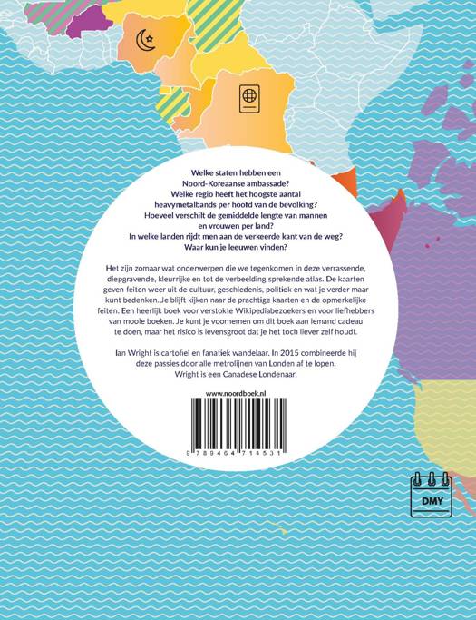 Het zijn zomaar wat onderwerpen die we tegenkomen in deze verrassende, diepgravende, kleurrijke en tot de verbeelding sprekende atlas. De kaarten geven feiten weer uit de cultuur, geschiedenis, politiek en wat je verder maar kunt bedenken. Je blijft kijken naar de prachtige kaarten en de opmerkelijke feiten. Een heerlijk boek voor verstokte Wikipediabezoekers en voor liefhebbers van mooie boeken. Je kunt je voornemen om dit boek aan iemand cadeau te doen, maar het risico is levensgroot dat je het toch liever zelf houdt.