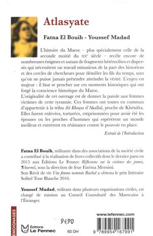 L’histoire du Maroc -plus spécialement celle de la seconde moitié du XX siècle- recèle encore de nombreuses énigmes et autant de fragments hétéroclites et dispersés qui nécessitent un travail minutieux de la part des historiens et des cercles de chercheurs pour démêler les fils du temps, sans qu’on ne puisse jamais prétendre atteindre la vérité. L’enjeu est majeur :il faut se pencher sur ces moments historiques qui ont forgé la conscience historique du Maroc. L’originalité de cet ouvrage est de donner la parole aux femmes victimes de cette tyrannie. Ces femmes ont toutes en commun d’appartenir à la tribu Ait Khouya d’Akallal, proche de Khénifra. Elles furent enlevées, torturées, emprisonnées pour avoir été les épouses ou les proches d’hommes qui espérèrent un monde meilleur et entrèrent en résistance contre le pouvoir en place. Extrait de l’introduction.
