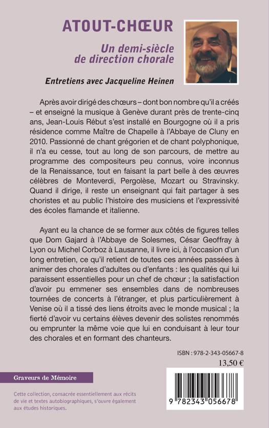 Après avoir dirigé des churs dont nombre qu'il a créés et enseigné la musique à Genève, Jean-Louis Rébut, passionné de chant grégorien et polyphonique, est Maître de Chapelle en Bourgogne. Quand il dirige, il partage avec choristes et public l'histoire des musiciens et l'expressivité des écoles flamande et italienne. Il livre ici les qualités essentielles pour un chef de chur, la satisfaction retirée de ses tournées à l'étranger, la fierté d'avoir vu certains élèves devenir des solistes renommés ou suivre sa trace.