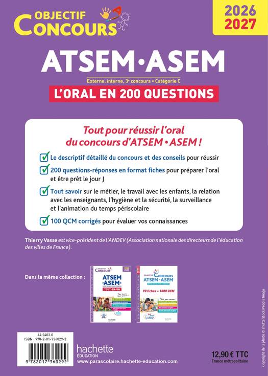 Tout pour réussir l'oral du concours d’ATSEM/ASEM ! Sous un format pratique, cet ouvrage propose une préparation intensive et efficace à l’épreuve orale du concours d’ATSEM : - Le descriptif détaillé du concours et des conseils pour réussir - 200 questions-réponses en format fiches pour préparer l'oral et être prêt le jour J - Tout savoir sur le métier, le travail avec les enfants, la relation avec les enseignants, l'hygiène et la sécurité, la surveillance et l'animation du temps périscolaire - 100 QCM corrigés pour évaluer vos connaissances - À jour des derniers textes officiels