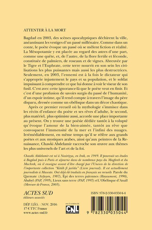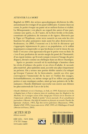 Bagdad en 2003, des scènes apocalyptiques déchirent la ville, anéantissant les vestiges d'un passé millénaire. Comme dans un conte, le poète évoque un passé où se mêlent fiction et réalité. La Mésopotamie y est placée au regard des astres d'une part, comme une quête, et, de l'autre, de la flore fertile et féconde, constituée de palmiers, de roseaux et de vignes. Abreuvée par le Tigre et l'Euphrate, cette terre nourrit en son sein les civilisations les plus puissantes mais aussi les plus destructrices. Seulement, en 2003, l'ennemi est à la fois le dictateur qui s'approprie injustement le pays et sa population, et le soldat impuissant à comprendre ce que lui donne à voir le viseur de son fusil. C'est avec cette ignorance-là que le poète veut en finir. Et c'est d'une profusion de savoirs surgis du passé de l'humanité, d'un espoir intime, qu'il rend compte à travers l'image du père disparu, dressée comme un obélisque dans un décor chaotique. Après ce premier recueil où la mythologie s'immisce dans les récits d'enfance du poète et ses rêves d'adulte, le second, plus matériel, plus optimiste aussi, accorde une place importante au présent. On y trouve une poésie dédiée tantôt à la volupté qu'évoque l'amour de la bien-aimée, tantôt au rêve que convoquent l'immensité de la mer et l'infini des nuages. Irrémédiablement, en même temps qu'il se réfère aux grands poètes et aux mystiques arabes, ainsi qu'aux peintres de la Renaissance, Chawki Abdelamir raccroche son oeuvre aux thèmes les plus universels de l'art et de la foi.