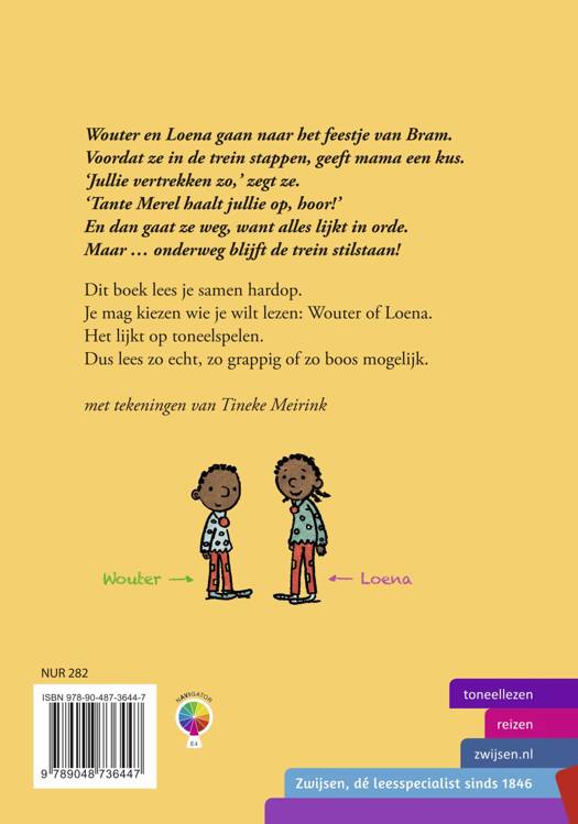 Wouter en Loena gaan naar het feestje van Bram. Voordat ze in de trein stappen, geeft mama een kus. ‘Jullie vertrekken zo,’ zegt ze. ‘Tante Merel haalt jullie op, hoor!’ En dan gaat ze weg, want alles lijkt in orde. Maar … onderweg blijft de trein stilstaan!
