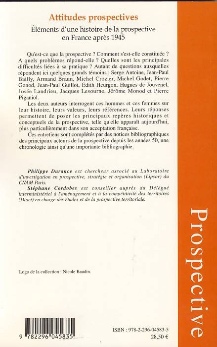 Qu'est-ce que la prospective ? A quels problèmes répond-elle ? Quels sont les difficultés liées à sa pratique ? Autant de questions auxquelles répondent ici quelques grands témoins : Serge Antoine, Jean-Paul Bailly, Armand Braun, Michel Crozier, Michel Godet, Pierre Gonod, Jean-Paul Guillot, Edith Heurgon, Hugues de Jouvenel, Josée Landrieu, Jacques Lesourne, Jérôme Monod et Pierre Piganiol.
