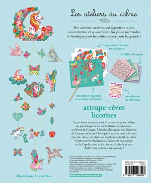 Un coffret contenant un livret de 8 pages avec des pas à pas, 5 feuilles d'origami dorées, 3 cartes épaisses avec des éléments prédécoupés à assembler (avec du fer à dorer, à gratter, en couleur), 150 strass de différentes couleurs et formes (fleurs, gouttes d'eau, petits et grands ronds), un stylet en bambou, ainsi qu' 1 fil de coton doré de 8 m. Thème : attrape-rêve sur le thème des licornes.