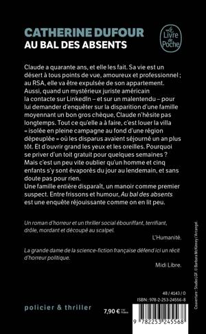 Claude a quarante ans, et elle les fait. Sa vie est un désert à tous points de vue, amoureux et professionnel ; au RSA, elle va être expulsée de son appartement. Aussi, quand un mystérieux juriste américain la contacte sur LinkedIn – et sur un malentendu – pour lui demander d’enquêter sur la disparition d’une famille moyennant un bon gros chèque, Claude n’hésite pas longtemps. Tout ce qu’elle a à faire, c’est louer la villa « isolée en pleine campagne au fond d’une région dépeuplée » où les disparus avaient séjourné un an plus tôt. Et d’ouvrir grand les yeux et les oreilles. Pourquoi se priver d’un toit gratuit pour quelques semaines ? Mais c’est sans doute un peu vite oublier qu’un homme et cinq enfants s’y sont évaporés du jour au lendemain, et sans doute pas pour rien. Une famille entière disparaît, un manoir comme premier suspect. Entre frissons et humour, Au bal des absents est une enquête réjouissante comme on en lit peu.