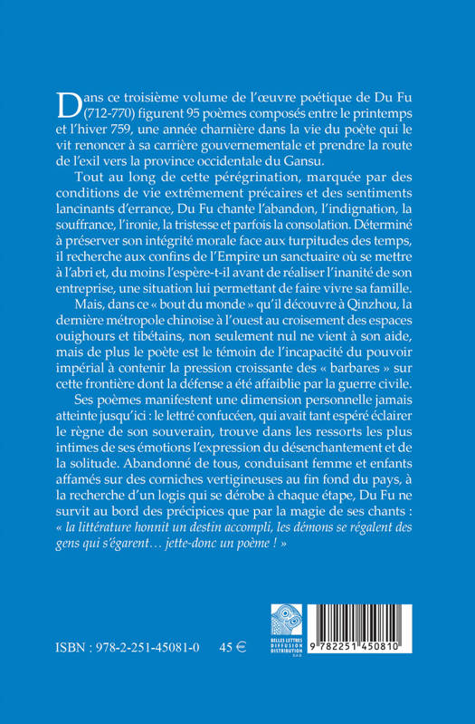 Dans ce troisieme volume de l'oeuvre poetique de Du Fu (712-770) figurent 95 poemes composes entre le printemps et l'hiver 759, une annee charniere dans la vie du poete qui le vit renoncer a sa carriere gouvernementale et prendre la route de l'exil vers la province occidentale du Gansu. Tout au long de cette peregrination, marquee par des conditions de vie extremement precaires et des sentiments lancinants d'errance, Du Fu chante l'abandon, l'indignation, la souffrance, l'ironie, la tristesse et parfois la consolation. Determine a preserver son integrite morale face aux turpitudes des temps, il recherche aux confins de l'Empire un sanctuaire ou se mettre a l'abri et, du moins l'espere-t-il avant de realiser l'inanite de son entreprise, une situation lui permettant de faire vivre sa famille. Mais, dans ce bout du monde qu'il decouvre a Qinzhou, la derniere metropole chinoise a l'ouest au croisement des espaces ouighours et tibetains, non seulement nul ne vient a son aide, mais de plus le poete est le temoin de l'incapacite du pouvoir imperial a contenir la pression croissante des barbares sur cette frontiere dont la defense a ete affaiblie par la guerre civile. Ses poemes manifestent une dimension personnelle jamais atteinte jusqu'ici: le lettre confuceen, qui avait tant espere eclairer le regne de son souverain, trouve dans les ressorts les plus intimes de ses emotions l'expression du desenchantement et de la solitude. Abandonne de tous, conduisant femme et enfants affames sur des corniches vertigineuses au fin fond du pays, a la recherche d'un logis qui se derobe a chaque etape, Du Fu ne survit au bord des precipices que par la magie de ses chants: la litterature honnit un destin accompli, les demons se regalent des gens qui s'egarent... jette-donc un poeme !