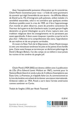Avec l'exceptionnelle puissance d'evocation qui le caracterise, Chaim Potok reconstitue pour nous - a l'aide de cette grammaire du souvenir qui regit l'ensemble de son oeuvre - les difficiles debuts de David Lurie. Fils d'immigrants juifs polonais, enfant malade a la sensibilite exacerbee, celui-ci ne connaitra que quelques annees d'enfance paisible avant la crise de 1929, ou il fera l'apprentissage d'un monde en plein desarroi, avant de prendre conscience de l'horreur de la guerre et de la barbarie nazie. Le petit garcon fragile deviendra un grand theologien au prix d'une rupture avec une tradition religieuse dont les enseignements ne lui paraissent pas assez approfondis. Il devra aussi s'exposer a perdre ce qui lui est le plus cher: l'affection et la comprehension des siens, l'approbation de ses maitres et de ses propres certitudes. A travers le New York de la Depression, Chaim Potok evoque ici avec une minutieuse tendresse les joies et les peines d'une famille juive. Cette vaste fresque se termine par un dechirant pelerinage de David a Bergen-Belsen, l'un des camps ou se melent a tout jamais les racines et les cendres du peuple juif.