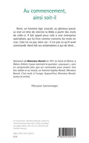 René, un homme âgé, esseulé, au glorieux passé, se met en tête de réécrire la Bible à partir des mots de celle-ci. Il fait appel pour cela à une entreprise spécialisée, qui lui livre comme convenu les mots en vrac. Cela ne va pas, bien sûr : il n'a pas ce qu'il avait commandé. René fait ses réclamations à qui de droit...