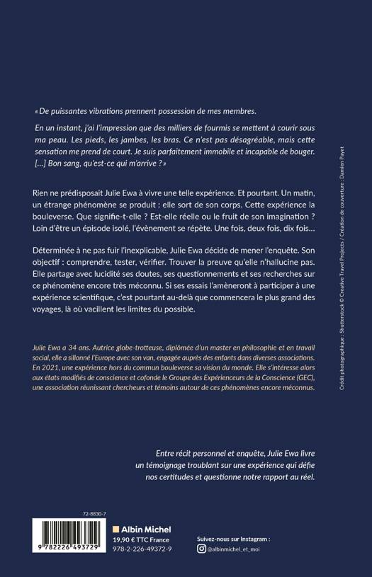 Déterminée à ne pas fuir l'inexplicable, Julie Ewa décide de mener l'enquête. Son objectif : comprendre, tester, vérifier. Trouver la preuve qu'elle n'hallucine pas. Elle partage avec lucidité ses doutes, ses questionnements et ses recherches sur ce phénomène encore très méconnu. Si ses essais l'amèneront à participer à une expérience scientifique, c'est pourtant au-delà que commencera le plus grand des voyages, là où vacillent les limites du possible.