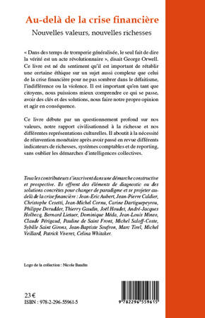 Rétablir une certaine éthique sur le sujet de la crise financière est nécessaire pour ne pas sombrer dans le défaitisme, l'indifférence ou la violence. Ce livre questionne nos valeurs, notre rapport civilisationnel à la richesse et nos différentes représentations culturelles, puis aboutit à la nécessité de réinvention monétaire après avoir passé en revue différents indicateurs de richesses, systèmes comptables et de reporting, sans oublier les démarches d'intelligences collectives.