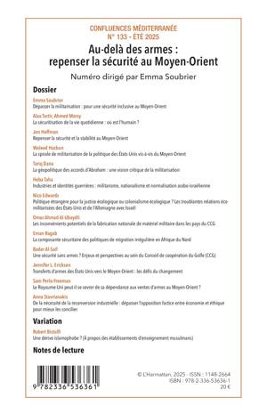 Sommaire: Dépasser la militarisation: pour une sécurité inclusive au Moyen-Orient; La sécuritisation de la vie quotidienne: où est l'humain ?; Repenser la sécurité et la stabilité au Moyen-Orient; La spirale de militarisation de la politique des États-Unis vis-à-vis du Moyen-Orient; La géopolitique des accords d'Abraham: une vision critique de la militarisation; Industries et identités guerrières: militarisme, nationalisme et normalisation arabo-israélienne; Politique étrangère pour la justice écologique ou colonialisme écologique ? Les troublantes relations éco-militarisées des États-Unis et de l'Allemagne avec Israël; Les inconvénients potentiels de la fabrication nationale de matériel militaire dans les pays du CCG; La composante sécuritaire des politiques de migration irrégulière en Afrique du Nord; Une sécurité sans armes ? Enjeux et perspectives au sein du Conseil de coopération du Golfe (CCG); Transferts d'armes des États-Unis vers le Moyen-Orient: les défis du changement; Le Royaume-Uni peut-il se sevrer de sa dépendance aux ventes d'armes au Moyen-Orient ?; De la nécessité de la reconversion industrielle: dépasser l'opposition factice entre économie et éthique pour mieux les concilier.