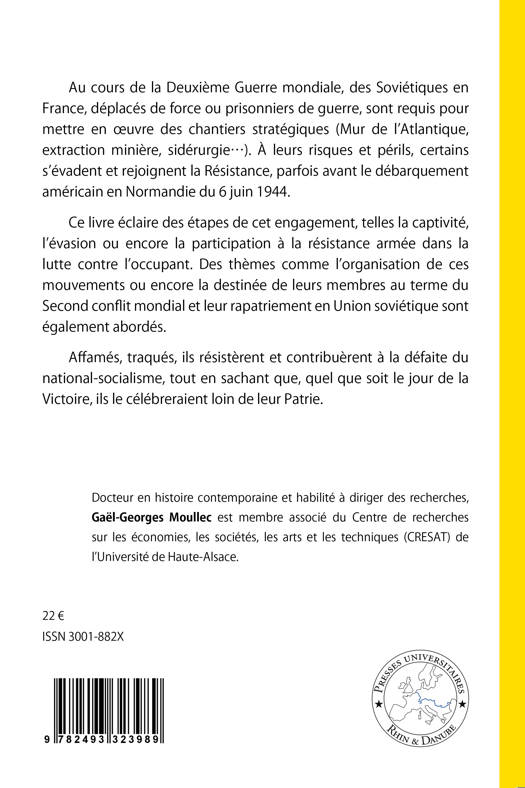 Au cours de la Deuxième Guerre mondiale, des Soviétiques en France, déplacés de force ou prisonniers de guerre, sont requis pour mettre en œuvre des chantiers stratégiques (Mur de l’Atlantique, extraction minière, sidérurgie…). À leurs risques et périls, certains s’évadent et rejoignent la Résistance, parfois avant le débarquement américain en Normandie du 6 juin 1944. Ce livre éclaire des étapes de cet engagement, telles la captivité, l’évasion ou encore la participation à la résistance armée dans la lutte contre l’occupant. Des thèmes comme l’organisation de ces mouvements ou encore la destinée de leurs membres au terme du Second conflit mondial et leur rapatriement en Union soviétique sont également abordés. Affamés, traqués, ils résistèrent et contribuèrent à la défaite du national-socialisme, tout en sachant que, quel que soit le jour de la Victoire, ils le célébreraient loin de leur Patrie.