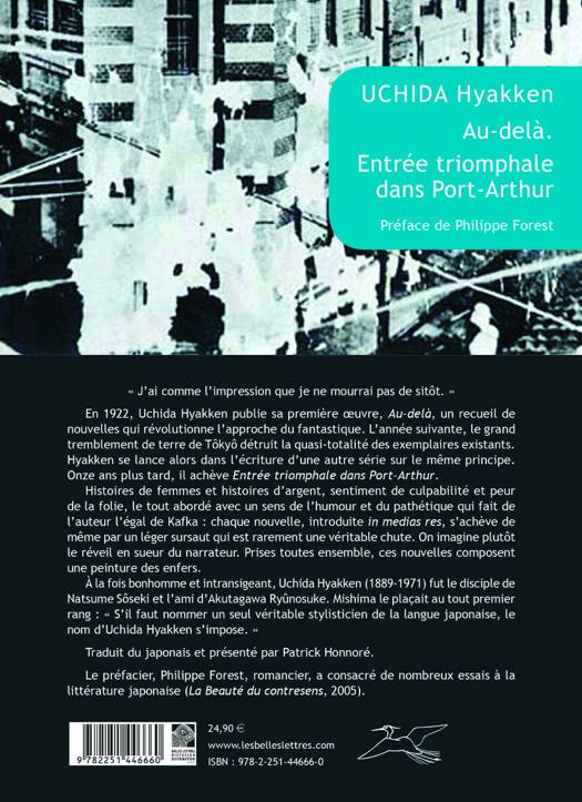 J'ai comme l'impression que je ne mourrai pas de sitot. En 1922, Uchida Hyakken publie sa premiere oeuvre, Au-dela, un recueil de nouvelles qui revolutionne l'approche du fantastique. L'annee suivante, le grand tremblement de terre de Tokyo detruit la quasi-totalite des exemplaires existants. Hyakken se lance alors dans l'ecriture d'une autre serie sur le meme principe. Onze ans plus tard, il acheve Entree triomphale dans Port-Arthur. Histoires de femmes et histoires d'argent, sentiment de culpabilite et peur de la folie, le tout aborde avec un sens de l'humour et du pathetique qui fait de l'auteur l'egal de Kafka: chaque nouvelle, introduite in medias res, s'acheve de meme par un leger sursaut qui est rarement une veritable chute. On imagine plutot le reveil en sueur du narrateur. Prises toutes ensemble, ces nouvelles composent une peinture des enfers. A la fois bonhomme et intransigeant, Uchida Hyakken (1889-1971) fut le disciple de Natsume Soseki et l'ami d'Akutagawa Ryunosuke. Mishima le placait au tout premier rang: S'il faut nommer un seul veritable stylisticien de la langue japonaise, le nom d'Uchida Hyakken s'impose.