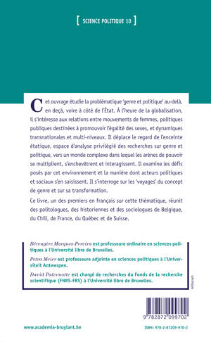 Cet ouvrage s'intéresse aux relations entre mouvements de femmes, politiques publiques d'égalité, et dynamiques transnationales et multi-niveaux. Il déplace le regard de l'enceinte étatique vers un monde complexe dans lequel les arènes de pouvoir se multiplient, s'enchevêtrent et interagissent. Il examine les défis posés par cet environnement et la manière dont acteurs politiques et sociaux s'en saisissent, ainsi que les "voyages" du concept de genre qui en résultent.