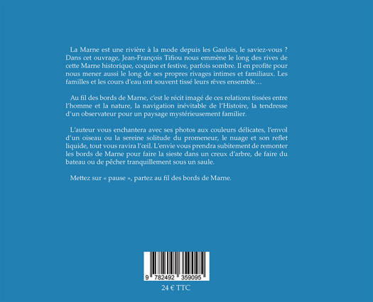 La Marne est une rivière à la mode depuis les Gaulois, le saviez-vous ? Dans cet ouvrage, Jean-François Tifiou nous emmène le long des rives de cette Marne historique, coquine et festive, parfois sombre. Il en profite pour nous mener aussi le long de ses propres rivages intimes et familiaux. Les familles et les cours d’eau ont souvent tissé leurs rêves ensemble… Au fil des bords de Marne, c’est le récit imagé de ces relations tissées entre l’homme et la nature, la navigation inévitable de l’Histoire, la tendresse d’un observateur pour un paysage mystérieusement familier. L’auteur vous enchantera avec ses photos aux couleurs délicates, l’envol d’un oiseau ou la sereine solitude du promeneur, le nuage et son reflet liquide, tout vous ravira l’œil. L’envie vous prendra subitement de remonter les bords de Marne pour faire la sieste dans un creux d’arbre, de faire du bateau ou de pêcher tranquillement sous un saule. Mettez sur « pause », partez Au fil des bords de Marne.