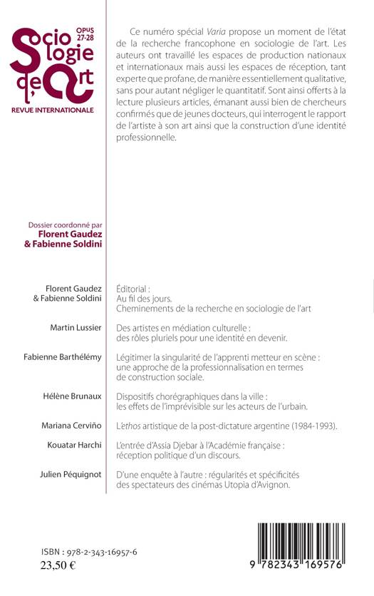 Ce numéro spécial Varia propose un moment de l'état de la recherche francophone en sociologie de l'art. les auteurs ont travaillé les espaces de production nationaux et internationaux mais aussi les espaces de réception, tant experte que profane, de manière essentiellement qualitative, sans pour autant négliger le quantitatif. Sont ainsi offerts à la lecture plusieurs articles, émanant aussi bien de chercheurs confirmés que de jeunes docteurs, qui interrogent le rapport de l'artiste à son art ainsi que la construction d'une identité professionnelle.