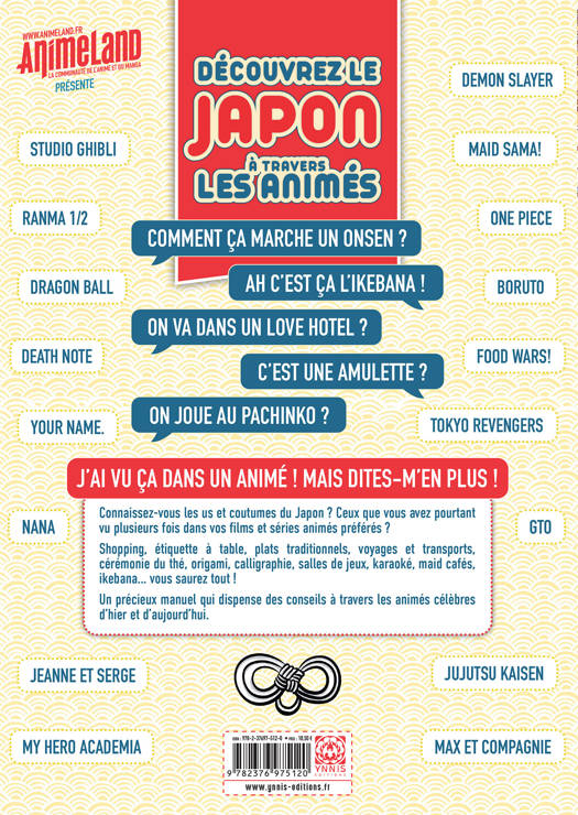 Connaissez-vous les us et coutumes du Japon ? Ceux que vous avez pourtant vus plusieurs fois dans vos séries et films animés préférés ? Shopping, étiquette à table, plats traditionnels, voyages et transports, cérémonie du thé, origami, calligraphie, salles de jeux, karaoké, maid cafés, ikebana… vous saurez tout ! Un précieux manuel qui dispense des conseils à travers les animés célèbres d’hier et d’aujourd’hui.