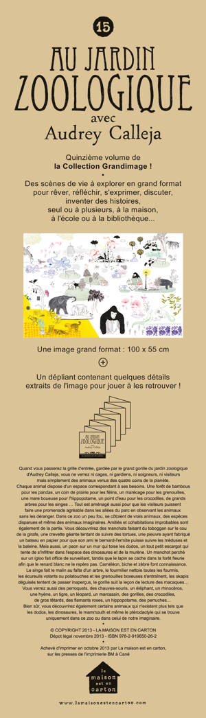 Une image grand format, tel un paravent, 100 x 55 cm, imprimée sur un papier d’art, qui se plie en 3 parties comme un accordéon + un dépliant (8 x 96 cm) contenant quelques détails extraits commentés de l’image pour jouer à les retrouver !