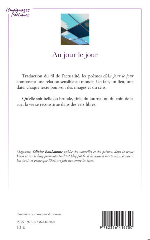 Traduction du fil de l'actualité, les poèmes d'Au jour le jour composent une relation sensible au monde. Un fait, un lieu, une date, chaque texte pourvoit des images et du sens. Qu'elle soit belle ou brutale, tirée du journal ou du coin de la rue, la vie se reconstitue dans des vers libres.