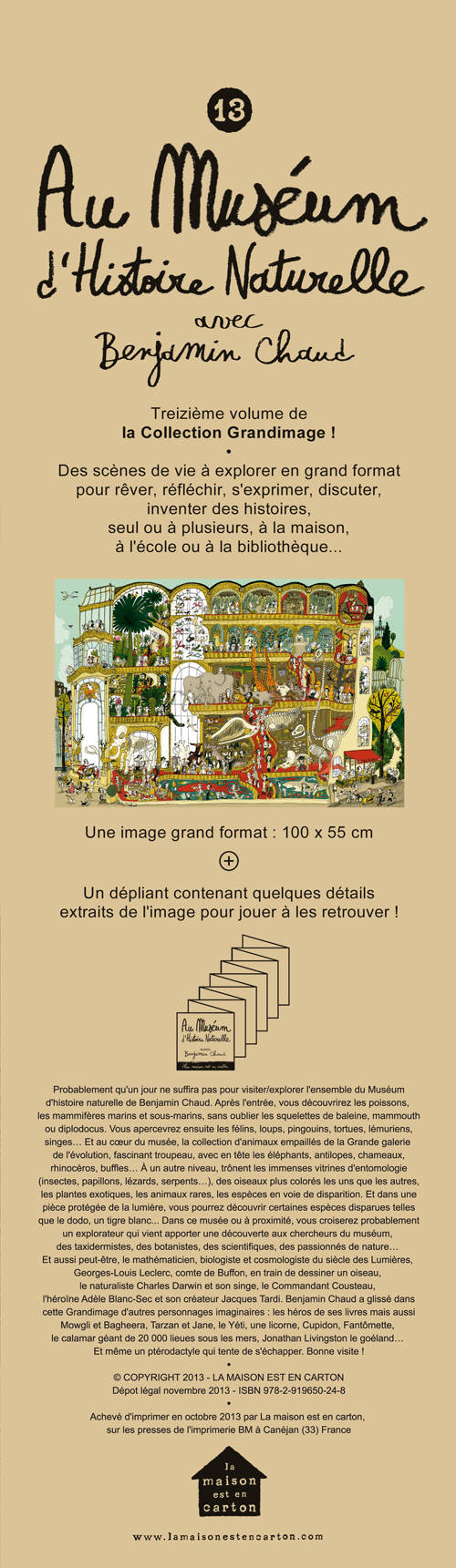 Probablement qu’un jour ne suffira pas pour visiter/explorer l’ensemble du Muséum d’histoire naturelle de Benjamin Chaud. Après l’entrée, vous découvrirez les poissons, les mammifères marins et sous-marins, sans oublier les squelettes de baleine, mammouth ou diplodocus. Vous apercevrez ensuite les félins, loups, pingouins, tortues, lémuriens, singes… Et au cœur du musée, la collection d’animaux empaillés de la Grande galerie de l’évolution, fascinant troupeau, avec en tête les éléphants, antilopes, chameaux, rhinocéros, buffles… À un autre niveau, trônent les immenses vitrines d’entomologie (insectes, papillons, lézards, serpents…), des oiseaux plus colorés les uns que les autres, les plantes exotiques, les animaux rares, les espèces en voie de disparition. Et dans une pièce protégée de la lumière, vous pourrez découvrir certaines espèces disparues telles que le dodo, un tigre blanc... Dans ce musée ou à proximité, vous croiserez probablement un explorateur qui vient apporter une découverte aux chercheurs du muséum, des taxidermistes, des botanistes, des scientifiques, des passionnés de nature… Et aussi peut-être, le mathématicien, biologiste et cosmologiste du siècle des Lumières, Georges-Louis Leclerc, comte de Buffon, en train de dessiner un oiseau, le naturaliste Charles Darwin et son singe, le Commandant Cousteau, l’héroïne Adèle Blanc-Sec et son créateur Jacques Tardi. Benjamin Chaud a glissé dans cette Grandimage d’autres personnages imaginaires : les héros de ses livres mais aussi Mowgli et Bagheera, Tarzan et Jane, le Yéti, une licorne, Cupidon, Fantômette, le calamar géant de 20 000 lieues sous les mers, Jonathan Livingston le goéland… Et même un ptérodactyle qui tente de s’échapper. Bonne visite !
